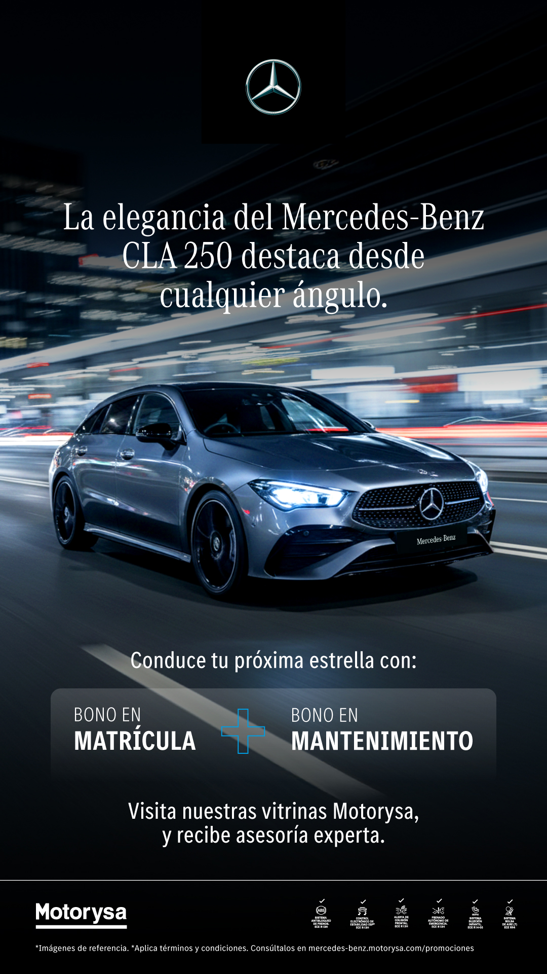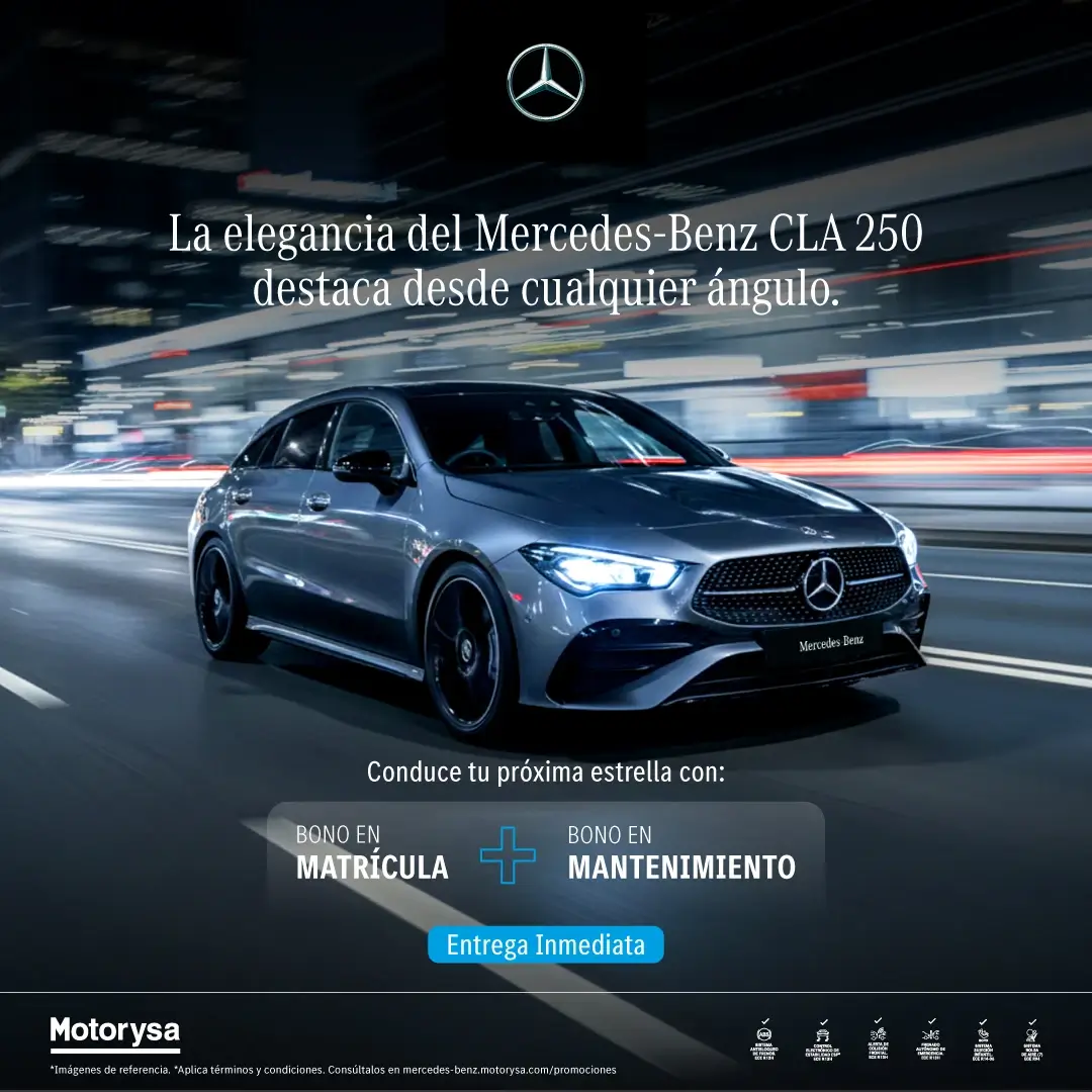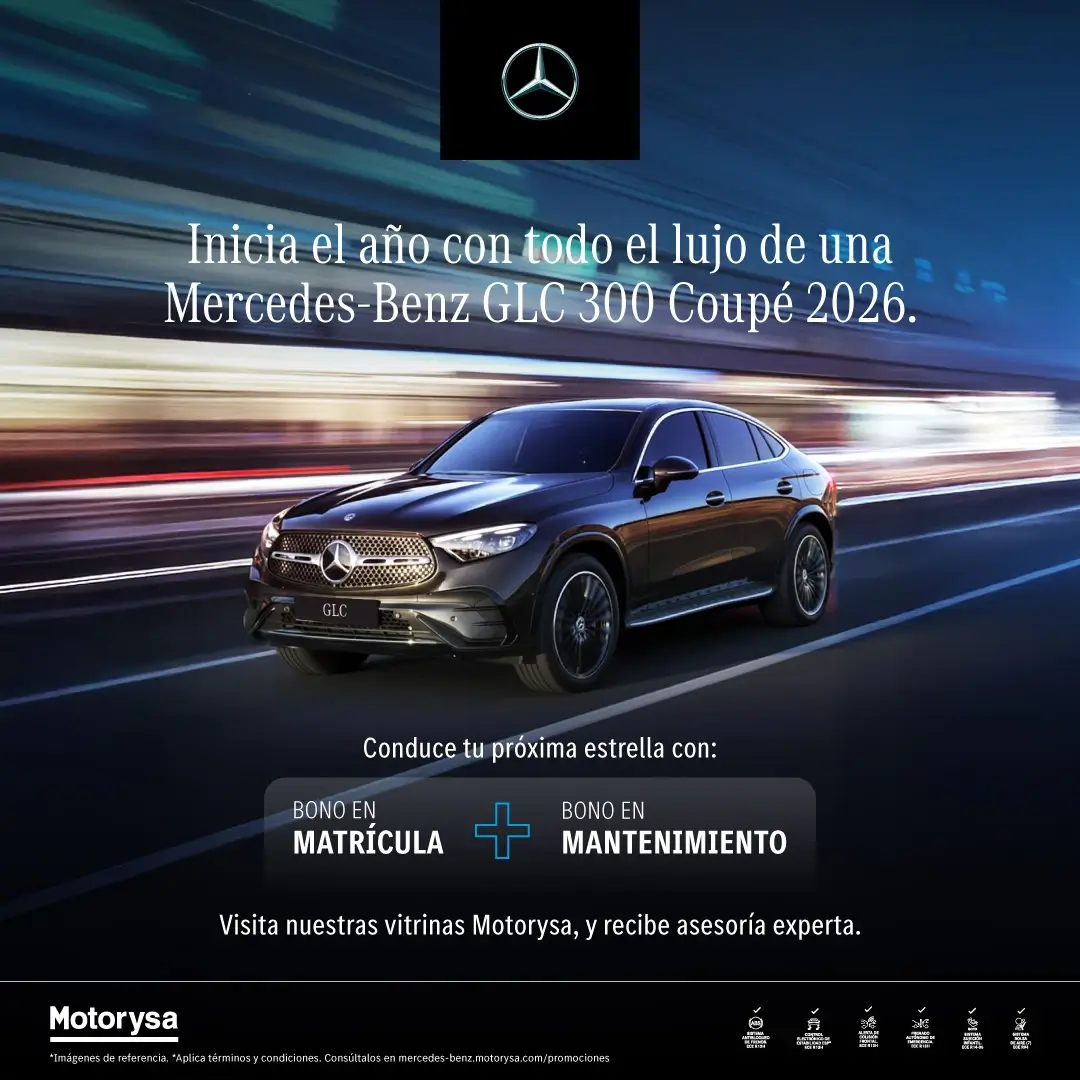 Las características definitivas del vehículo y las condiciones de venta serán las que conozca y acepte el comprador en la orden de pedido. Algunos accesorios son parte de la ambientación fotográfica o de otras versiones del vehículo. Pueden haberse producido cambios o modificaciones en el diseño y/o equipamiento del producto, los cuales sugerimos verificar en nuestra red de concesionarios Motorysa. Colores e inventario están sujetos a disponibilidad, los precios varían de acuerdo con las especificaciones de cada referencia. El bono matrícula aplica solo para las referencias EQA 250+ 2026, GLC 300 COUPÉ 2026, GLE 450 2026, AMG GLE 53, CLA 250 2026. El valor del bono dependerá de la negociación que se haga entre el asesor y el cliente. El mantenimiento que se ofrece aplica solo para el primer mantenimiento y solo aplica en los talleres Motorysa Mercedes-Benz. Estos ganchos no se cambiarán por dinero en efectivo. Aplica términos y condiciones, sujeto a disponibilidad de inventario. Válido del 1 de enero al 31 de enero de 2026.