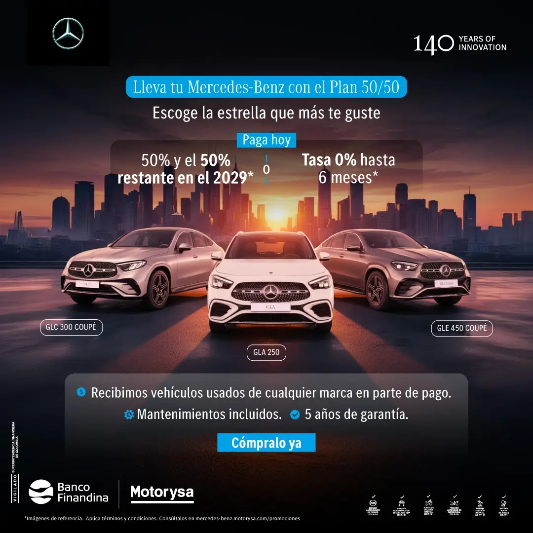 Aplican términos y condiciones. Aplican solamente en vitrinas Motorysa Mercedes-Benz ubicadas a nivel nacional. Los vehículos usados en parte de pago deberán primero ser revisados y realizarle un peritaje por parte de Motorysa para ofrecerle un valor comercial, esto se definirá al momento de la negociación con el asesor de Motorysa que lo asesore. Los mantenimientos que están incluidos en la negociación son dos (2). Los 5 años de garantía o 100.000 kilómetros, lo primero que ocurra, son directamente con la marca. El plan 50/50 es nombrado por Finandina como Plan InnovaAuto 36 Meses: La aprobación de la solicitud estará sujeta a las políticas de crédito y condiciones de financiación definidas por el Banco Finandina. Aplica únicamente para financiaciones en plan tradicional con cuota inicial desde el 30% y residual del 50% del valor del vehículo con plazo a 24 o 36 meses. El valor de la cuota no incluye las primas por pólizas de seguros. Las primas por pólizas de seguros se cobrarán mensualmente a partir del desembolso de la financiación salvo que se haya convenido de otra forma. Aplica únicamente para vehículos particulares nuevos MERCEDES BENZ aliados de Banco Finandina a nivel nacional. Vigencia del 1° al 30 de Abril de 2026, o hasta cambios en la lista de precios o política de financiación, lo que primero ocurra.El plan tasa 0% en Finandina se conoce como Plan Duo Subvencionado 6 Meses: La aprobación de la solicitud estará sujeta a las políticas de crédito y condiciones de financiación definidas por el Banco Finandina. Aplica únicamente para financiaciones en plan tradicional con cuota inicial desde 20% y sin residual con plazo hasta 72 meses, hasta riesgos S. El período de tasa especial aplica durante los primeros 6 meses del crédito y comprende abono a capital así cómo pago de intereses, durante ese periodo del crédito. A partir del mes 7 aplica la tasa vigente. El valor de la cuota no incluye las primas por pólizas de seguros. Las primas por pólizas de seguros se cobrarán mensualmente a partir del desembolso de la financiación salvo que se haya convenido de otra forma. Aplica únicamente para referencias seleccionadas de vehículos particulares nuevos MERCEDES - BENZ comercializadas por MOTORYSA, aliado del Banco Finandina. Vigencia del 1° al 30 de Abril de 2026 o hasta que cambien las condiciones de financiación, lo que primero ocurra.