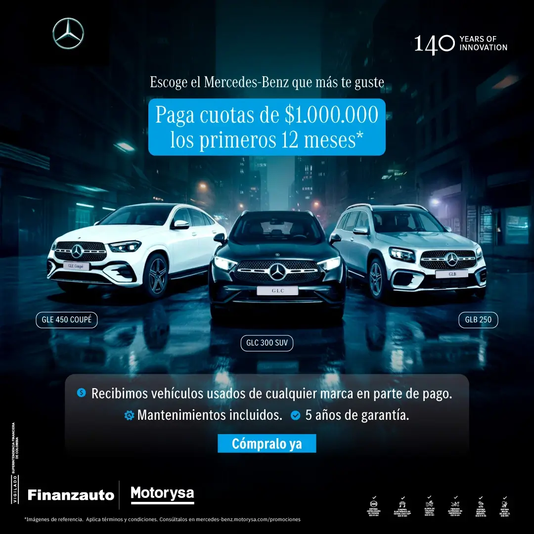 Aplican términos y condiciones. Aplican solamente en vitrinas Motorysa Mercedes-Benz ubicadas a nivel nacional. Los vehículos usados en parte de pago deberán primero ser revisados y realizarle un peritaje por parte de Motorysa para ofrecerle un valor comercial, esto se definirá al momento de la negociación con el asesor de Motorysa que lo asesore. Los mantenimientos que están incluidos en la negociación son dos (2). Los 5 años de garantía o 100.000 kilómetros, lo primero que ocurra, son directamente con la marca. FINANZAUTO S.A BIC aplica condiciones y restricciones. Válido para vehículos nuevos particulares. La aprobación del crédito está sujeta a la política de riesgo de Finanzauto S.A. BIC. Vigencia del 9 de abril al 29 de mayo de 2026, con desembolso hasta el 30 de junio de 2026. FINANZAUTO A MILLÓN: aplica para financiación hasta de $250 millones; el cliente pagará una cuota mensual de $1 millón durante los 12 primeros meses con una cuota inicial del 20% o cuota inicial del 10% para los 6 meses. Este valor cubrirá seguros, intereses y capital, en este orden. Los intereses corrientes generados durante el primer año se incluirán en la financiación y se pagarán dentro de la cuotas pactadas, de acuerdo con la tasa de interés convenida. Aplica para clientes con experiencia financiera en montos similares, buen hábito de pago, ingresos mínimos de 2.5 S.M.M.L.V., respaldo patrimonial en ciudad principal y un puntaje superior a 650 en Data crédito, no hayan presentado mal hábito de pago en obligaciones abiertas ni cerradas.