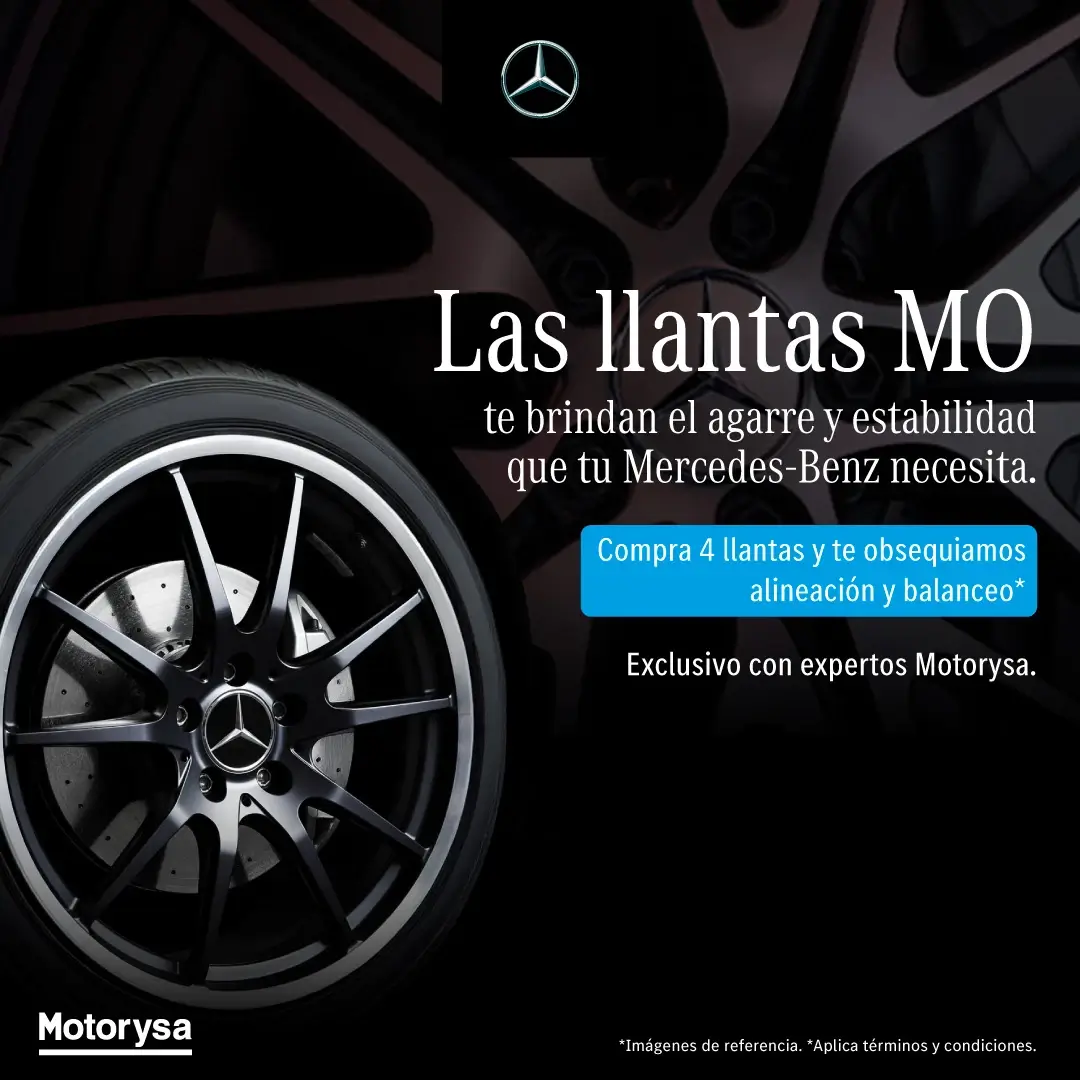 Aplican términos y condiciones. Sujeto a disponibilidad de inventario de llantas. El beneficio de alineación y balanceo gratuito aplica para las llantas que sean vendidas por Motorysa Mercedes-Benz a nivel nacional. El beneficio no se puede reemplazar por dinero en efectivo. Aplican términos y condiciones. Válido del 1 al 31 de enero de 2026