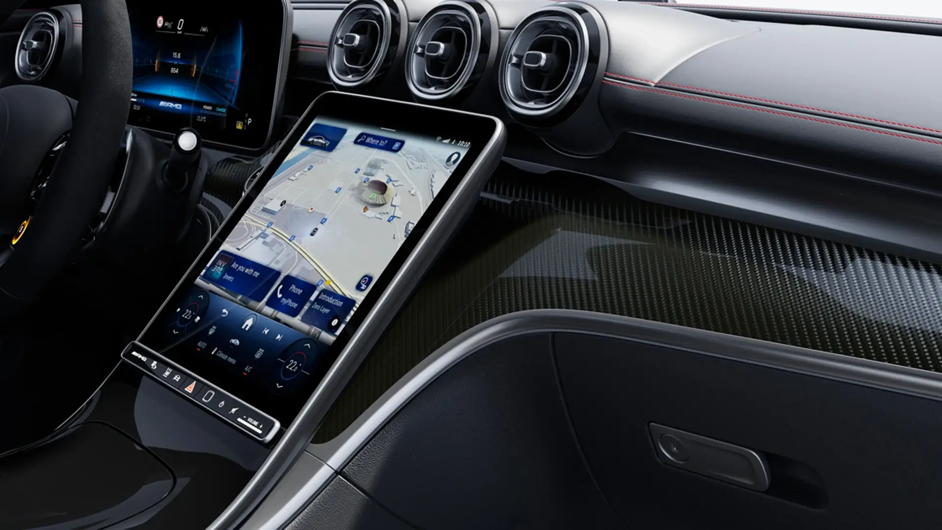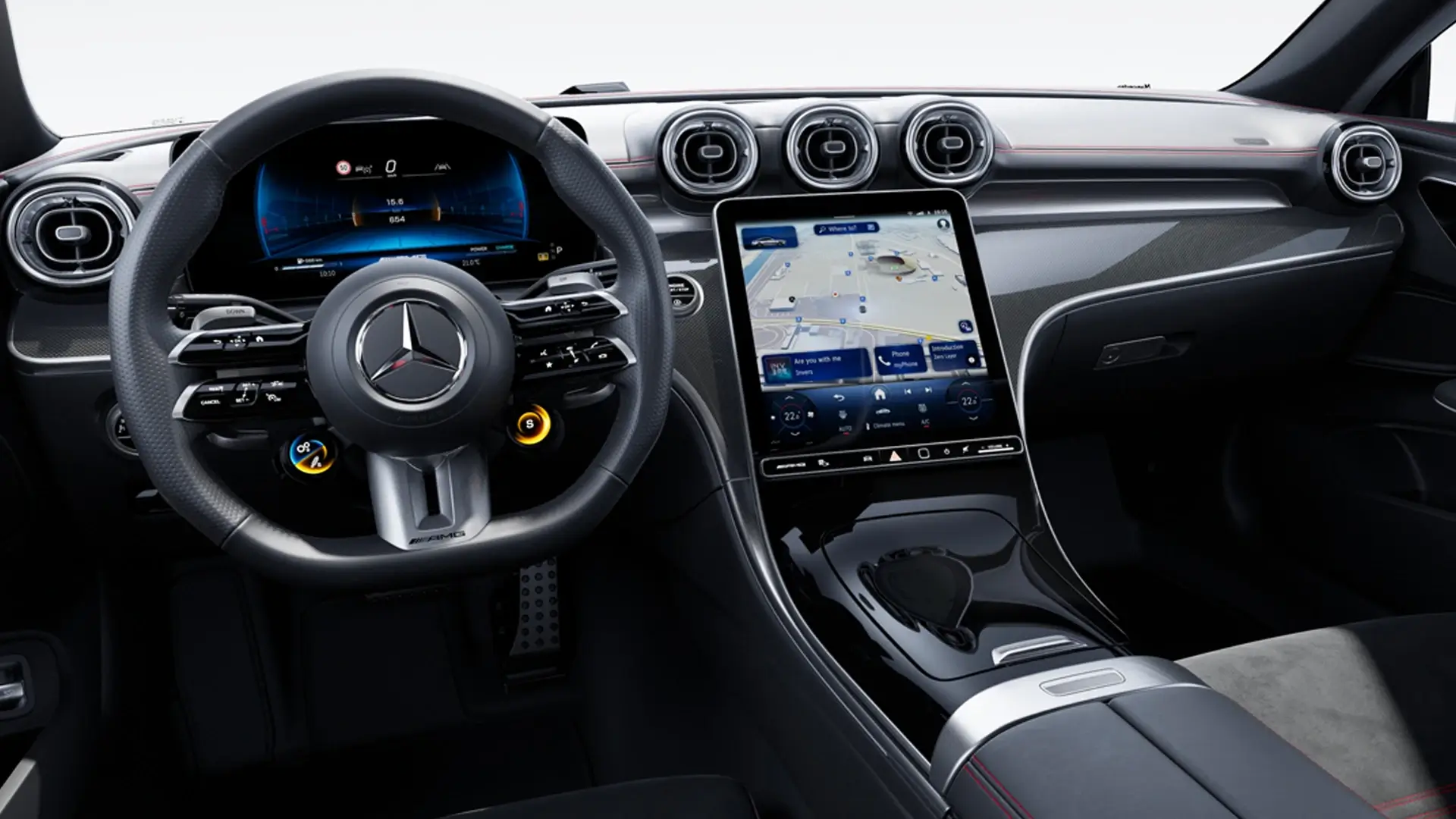 El interior es cockpit AMG con asientos performance de Nappa, volante achatado y MBUX hyperscreen, creando un espacio ergonómico y lujoso para cuatro con detalles en alcantara y rojo para inmersión total en la conducción.