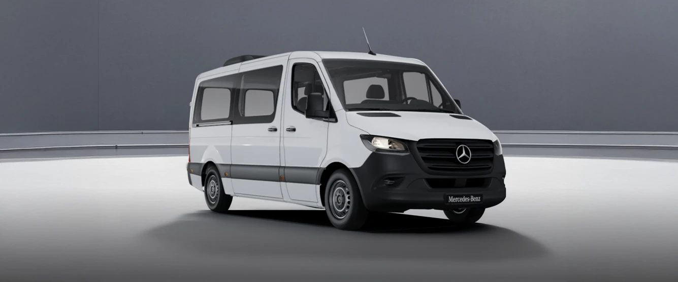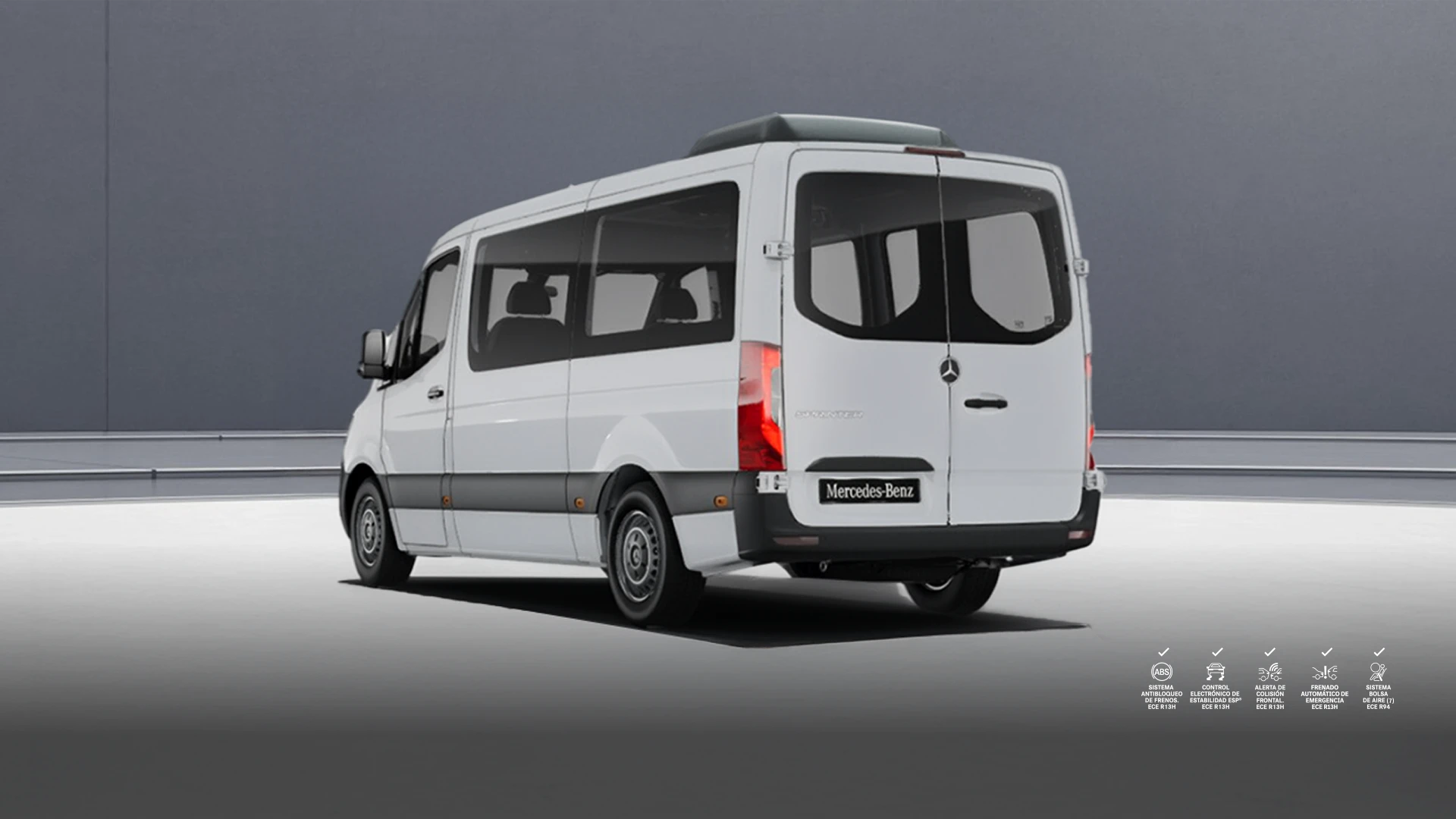 La Mercedes-Benz 411 CDI para pasajeros destaca por un diseño exterior robusto y elegante, propio de la línea Sprinter. En el frontal resalta la emblemática parrilla con el logo centrado, acompañada de faros grandes que ofrecen excelente visibilidad. Su carrocería alargada presenta líneas limpias y aerodinámicas, complementadas por amplias ventanas laterales que brindan luminosidad y una vista amplia a los ocupantes.