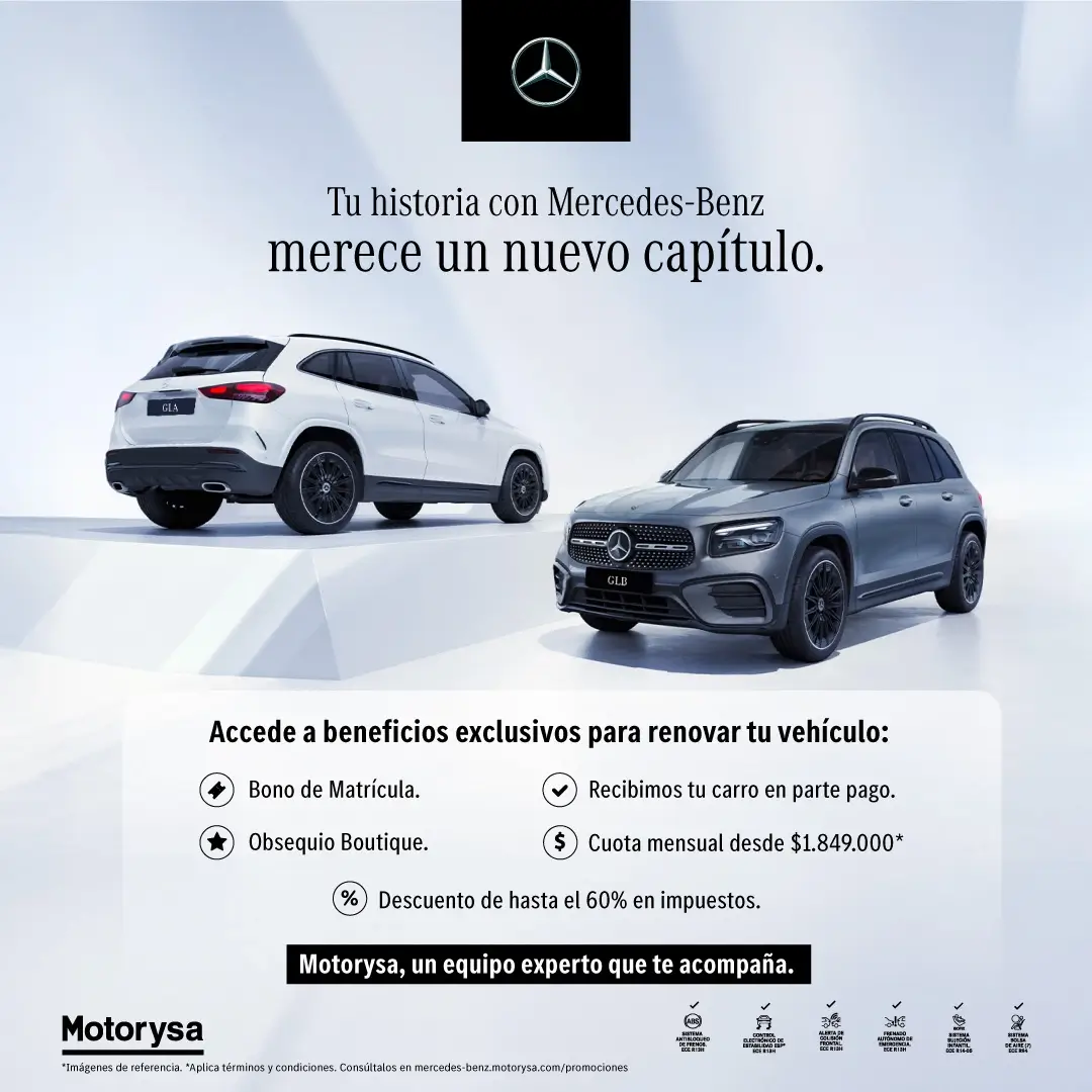 Aplican términos y condiciones. Válido solamente en vitrinas Motorysa Mercedes-Benz. Bono matrícula aplica descuento hasta de $2.000.000 en el vehículo. Descuento de hasta el 60% en impuestos aplica solamente si el vehículo se matricula en la ciudad de Cali y es solo para vehículos eléctricos e híbridos. Obsequio boutique es un bono de $500.000 que puede redimir en nuestras vitrinas. No es válido para cambiarlo por dinero en efectivo. La cuota mensual de $1.849.000 aplica para el modelo A250 y consiste en un Plan residual: 40% en coutoa inicial y residual del 40% .A 72 meses. Tasa promedio de 1,25%. Promoción válida hasta el 31 de octubre.